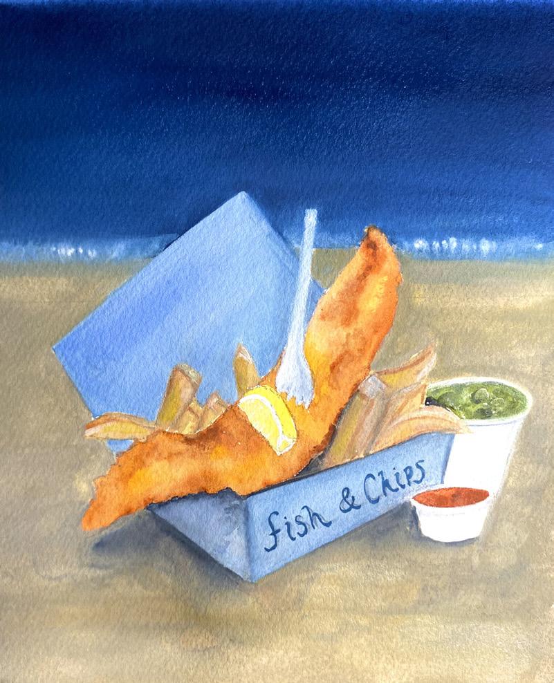 There are few sights as soul stirring, few aromas as instantly comforting, as the golden glow of freshly fried fish resting atop a tumble of crisp, fluffy centered chips. LizzieJayne’s painting captures not just a meal, but a ritual woven deep into Britain’s culinary identity. This is food you don’t merely eat — it’s food you feel. The crunch that gives way to tender flakes of white fish, the salt that lingers on your lips, the steamy vinegar tang that rises up and makes your mouth water before the first bite. It is finger licking, paper wrapping, seaside savouring joy — the kind that belongs as much to memory as it does to the present moment. Fish & chips have always been more than sustenance; they are a celebration of simple pleasures, a great equaliser enjoyed by workers, wanderers, and dreamers alike. Whether eaten with wooden forks under a grey British sky, or devoured straight from the newspaper on the way home. It remains a timeless dish that refuses to be hurried, no matter how fast we live.
