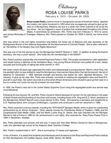 February 4, 1913 – October 24, 2005 Rosa Louise Parks, a prime mover in changing the course of American history, sparked the modern civil rights movement in 1955 when she courageously refused to give up her seat on a Montgomery, Alabama city bus to a white man when ordered to do so by the bus driver. Her act triggered a wave of protest that reverberated throughout the United States. A seamstress by profession, Mrs. Parks was born February 4, 1913 to Leona and James McCauley in Tuskegee, Alabama. Mrs. Parks passed on October 24, 2005 in Detroit, her home since 1957. She was active in the civil rights movement long before her brave act of defiance and was secretary of the Montgomery Branch of the National Association for the Advancement of Colored People. She is often referred to as “the Mother of the Modern Day Civil Rights Movement.” She was one of the first women to join the Montgomery NAACP Branch in 1943. In addition to being the branch secretary, she was a youth advisor. She holds two life memberships in the NAACP. Mrs. Parks’s activism started after she married Raymond Parks in 1932. The couple volunteered on voter registration and raised money in defense of the Scottsboro Boys, nine young African American men pulled off a train, falsely accused and found guilty of raping two white women in 1931. Her action nearly 50 years ago captivated the nation and helped propel a young preacher, Martin Luther King, into the spotlight after he was drafted to head the Montgomery Improvement Association that led the boycott. Her act of defiance on December 1, 1955 reflected strength and bravery that belied her calm, dignified demeanor. For refusing to give up her seat, Mrs. Parks was arrested, convicted of violating the segregation laws and fined $10, plus $4 in court fees. Her action occurred at a time when African Americans who refused to give up their seat on a bus to a white man could not only be arrested, but even killed. In 1956, the Parks’s case led to the United States Supreme Court ruling that segregated public bus service was unconstitutional. Following the bus boycott, Mr. and Mrs. Parks moved to Detroit because of concern for her well-being in the wake of death threats and the bombing of churches and houses, including those of Dr. King and E.D. Nixon, president of the Montgomery NAACP Branch and a close adviser to Mrs. Parks. She became a secretary and receptionist to U.S. Representative John Conyers (D-Michigan), a position she continued in until her retirement in 1988. Mrs. Parks received numerous awards, including the 1979 NAACP Spingarn Medal, which is given for outstanding achievement by an African American. Other awards include the Presidential Medal of Freedom (1996) and the Congressional Gold Medal (1999), and the Martin Luther King Sr. Award. She was inducted into the Michigan Women’s Hall of Fame in 1983 for her achievements in civil rights. She received the Rosa Parks Peace Prize in 1994 in Stockholm, Sweden. Mrs. Parks attended rural schools until she was 11-years-old, then Miss White’s School for Girls in Montgomery. Later she attended high school at the Alabama State Teachers College. Mrs. Parks’s husband died in 1977. She is survived by 13 nieces and nephews. In lieu of flowers, it is asked that students and individuals send donations to the Rosa and Raymond Parks Institute for Self Development, 65 Cadillac Square, Suite 2200, Detroit, MI 48226.