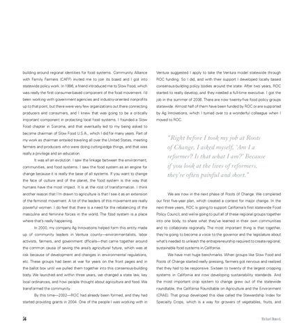 Food chapter in Sonoma, and that eventually led to my being asked to become chairman of Slow Food U.S.A., which I did for many years. Part of my work as chairman entailed traveling all over the United States, meeting farmers and producers who were doing cutting-edge things, and that was really a privilege and an education. It was all an evolution. I saw the linkage between the environment, communities, and food systems. I saw the food system as an engine for change because it is really the base of all systems. If you want to change the face of culture and of the planet, the food system is the way that