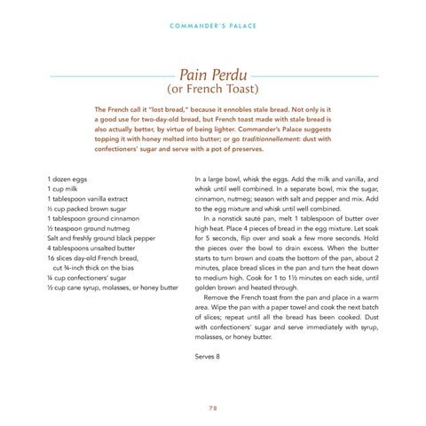 (or French Toast) The French call it “lost bread,” because it ennobles stale bread. Not only is it a good use for two-day-old bread, but French toast made with stale bread is also actually better, by virtue of being lighter. Commander’s Palace suggests topping it with honey melted into butter; or go traditionnellement: dust with confectioners' sugar and serve with a pot of preserves.