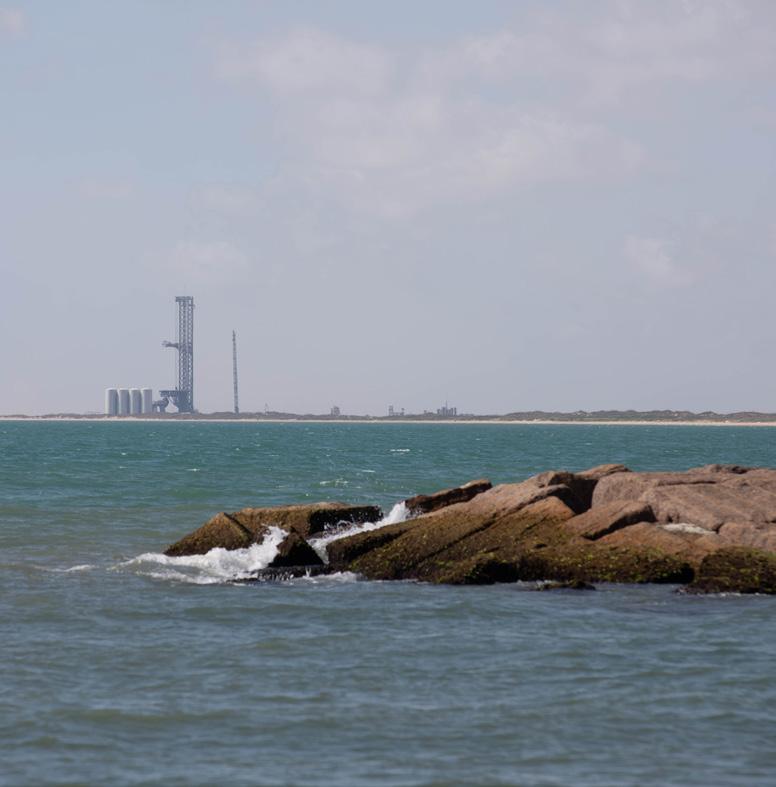 Relatively new to the South Texas skyline is the SpaceX launch site at Boca Chica Beach in Brownsville, Texas. This vantage point is off South Padre Island via tour boat. In October, SpaceX conducted a new rocket launch test, successfully returning the rocket’s boost er to the base at the launch site. The launch site and nearby produc tion facilities are also known as Star base, dubbed so by SpaceX.