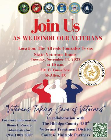 Judge Orlando Esquivel, the presiding judge of the 430th Veterans Treatment Court, and Sergeant Major Clifford E. Lovejoy will serve as guest speakers for Veterans Day. Together with their team of mentors and participants, they are committed to making a positive impact in the lives of veterans who have selflessly dedicated themselves to serving our nation. The event will be held Tuesday, November 11, at 10 a.m. at the Alfredo Gonzalez Texas State Veterans Home, 301 E Yuma Ave. in McAllen.
