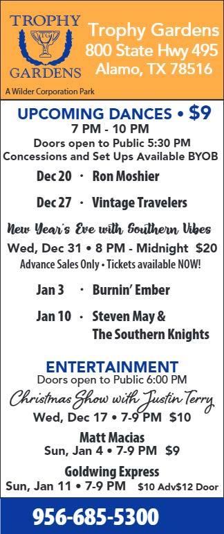 New Year’s Eve w/Southern Vibes 8:00 PM Trophy Gardens RV Resort Alamo (956) 6855300 $20