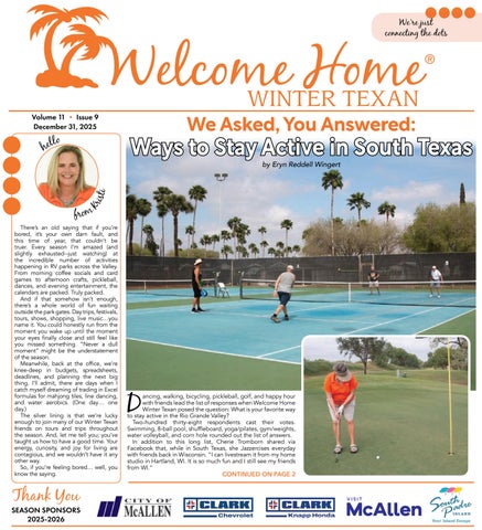 friends. It is with you in mind that Kristi Collier and her team reach out to you, every chance we get, even if it has to be from a distance and are already focusing on the memories we will make together in 2021. In the meantime, Kristi and her team wish you a safe and lovely holiday and a happy and healthy new year! Let us know how you are celebrating the coming year by engaging on the Welcome Home RGV and Winter Texan pages on Facebook, Instagram, and Twitter. Share your pics. We would love to see them! We look forward to seeing you all very, very soon! • YEARBOOK CONTINUED ON PAGE 4 >>