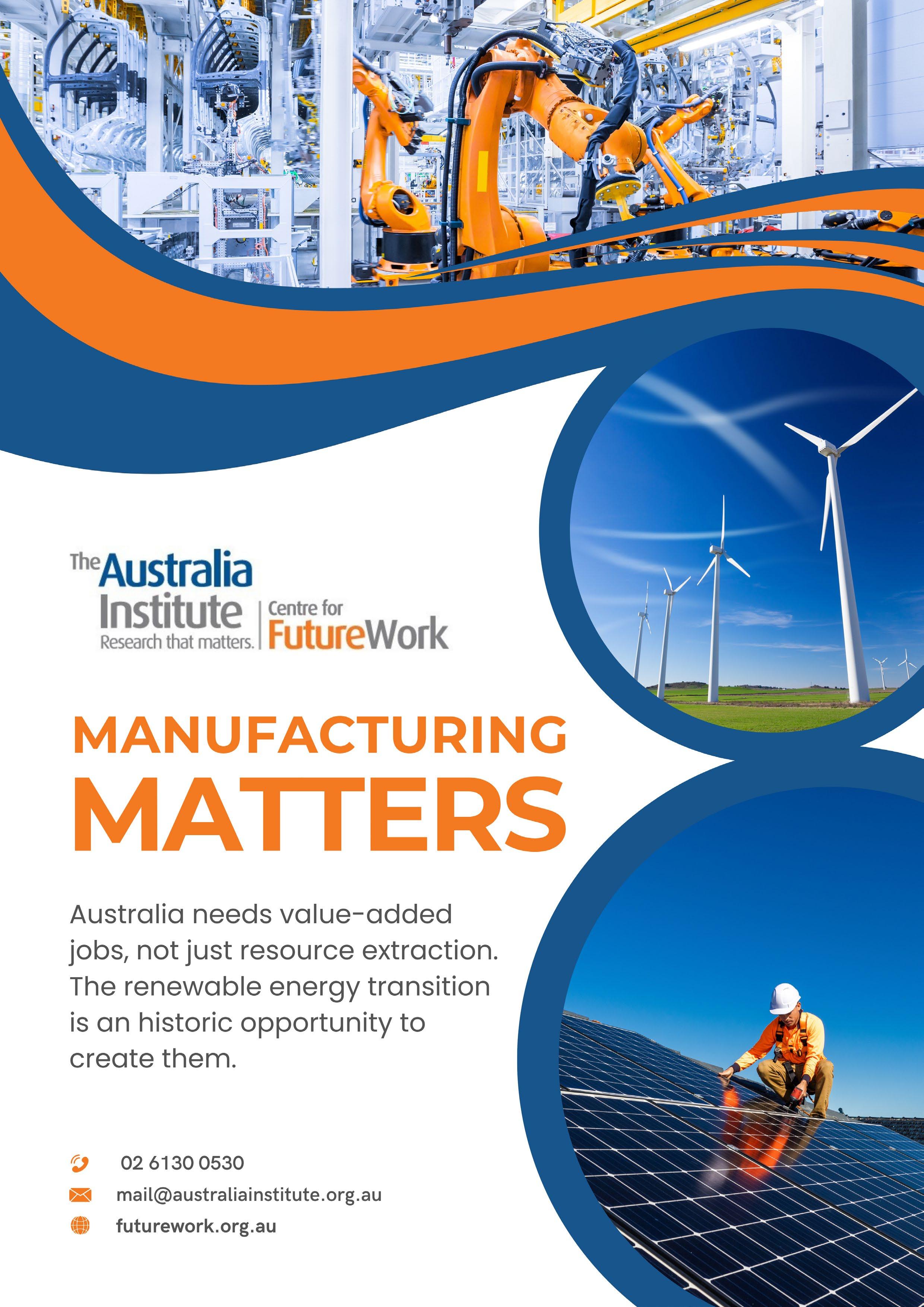The Centre for Future Work: Making Australia’s Renewable Energy Revolution Happen As a research centre focusing on the economic issues facing working people, the Centre for Future Work has long advocated for the importance of manufacturing for Australia’s economy.
