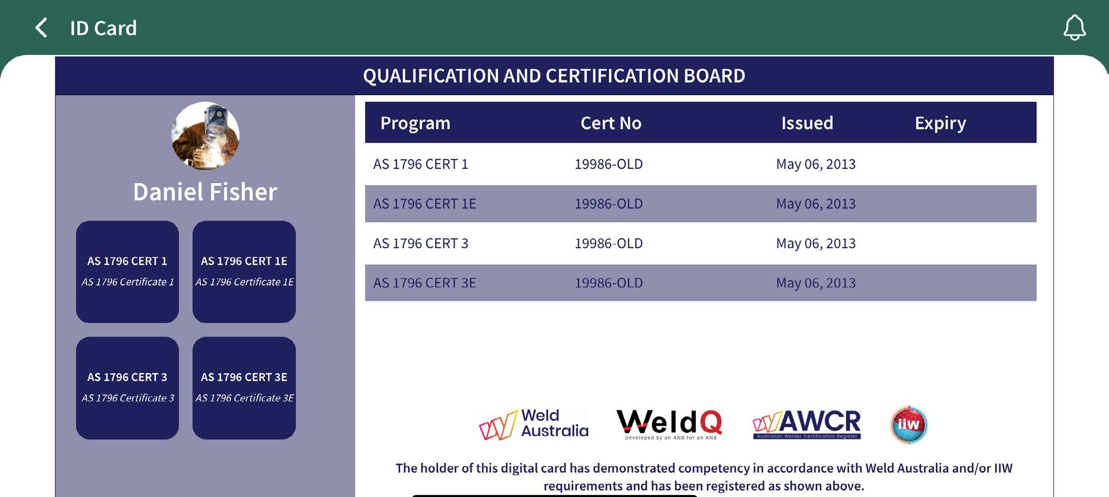 WeldQ is available for welders, inspectors, supervisors, and coordinators to manage their qualifications and certifications, and to use as a digital ID card or wallet (see the screenshot below). The WeldQ app can be used to view your digital Welder, Supervisor or Certification cards, awarded diplomas and certificates, status and results of applications, and WeldQ emails.