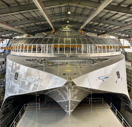 Incat was the winner of the 2025 Tasmanian Project of the Year Award for Hull 096, the world’s largest battery-electric ship. At 130m in length and designed to carry 2,100 passengers and 225 vehicles, the Hull 096 represents a giant leap in the decarbonisation of large-scale commercial shipping. Launched in May 2025, Hull 096 is being delivered to South American operator Buquebus and will operate between Argentina and Uruguay, reducing emissions across one of the busiest ferry routes in the region. The fabrication of Hull 096 was a project of unprecedented scale. More than 900 tonnes of marinegrade aluminium plate and extrusion were cut, formed, welded, and assembled into a structure of extraordinary precision and complexity.