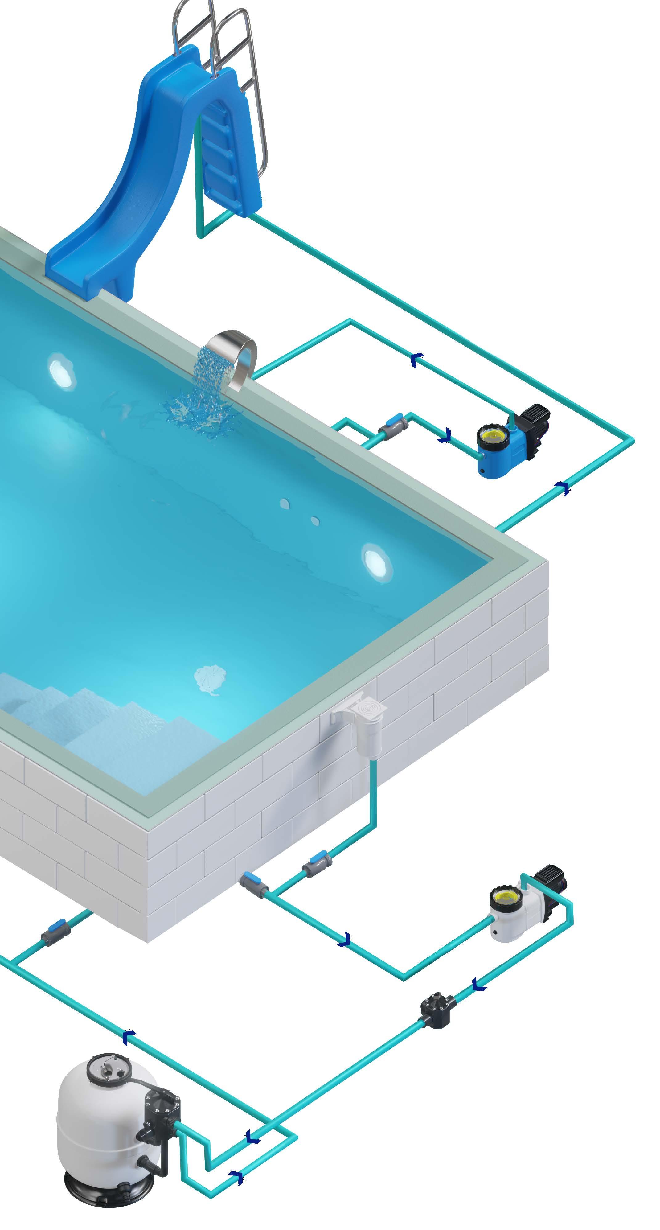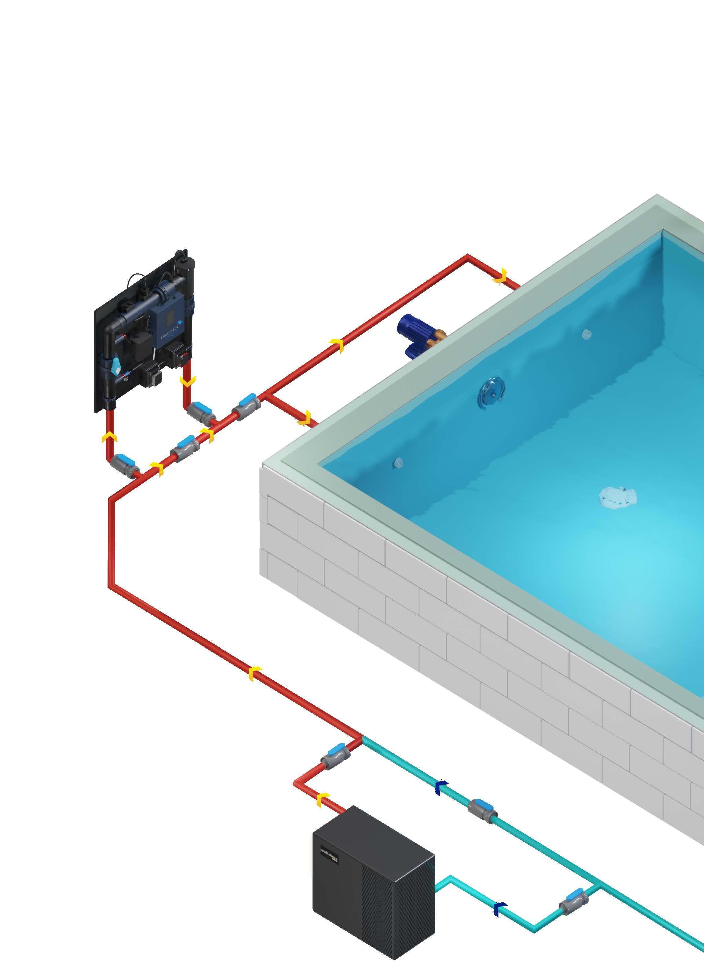 D Hvis rørene er for små, bruger du for meget strøm. Din installatør kan hjælpe med at finde den rigtige størrelse. Welldanas rørberegner giver svaret. Husk isolering af rørene og husk altid at montere ventiler foran de dele, der er monteret under vandniveau, så bassinet ikke skal tømmes, hvis der skal udføres service.