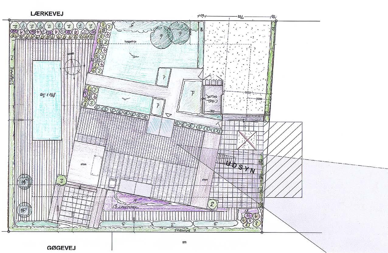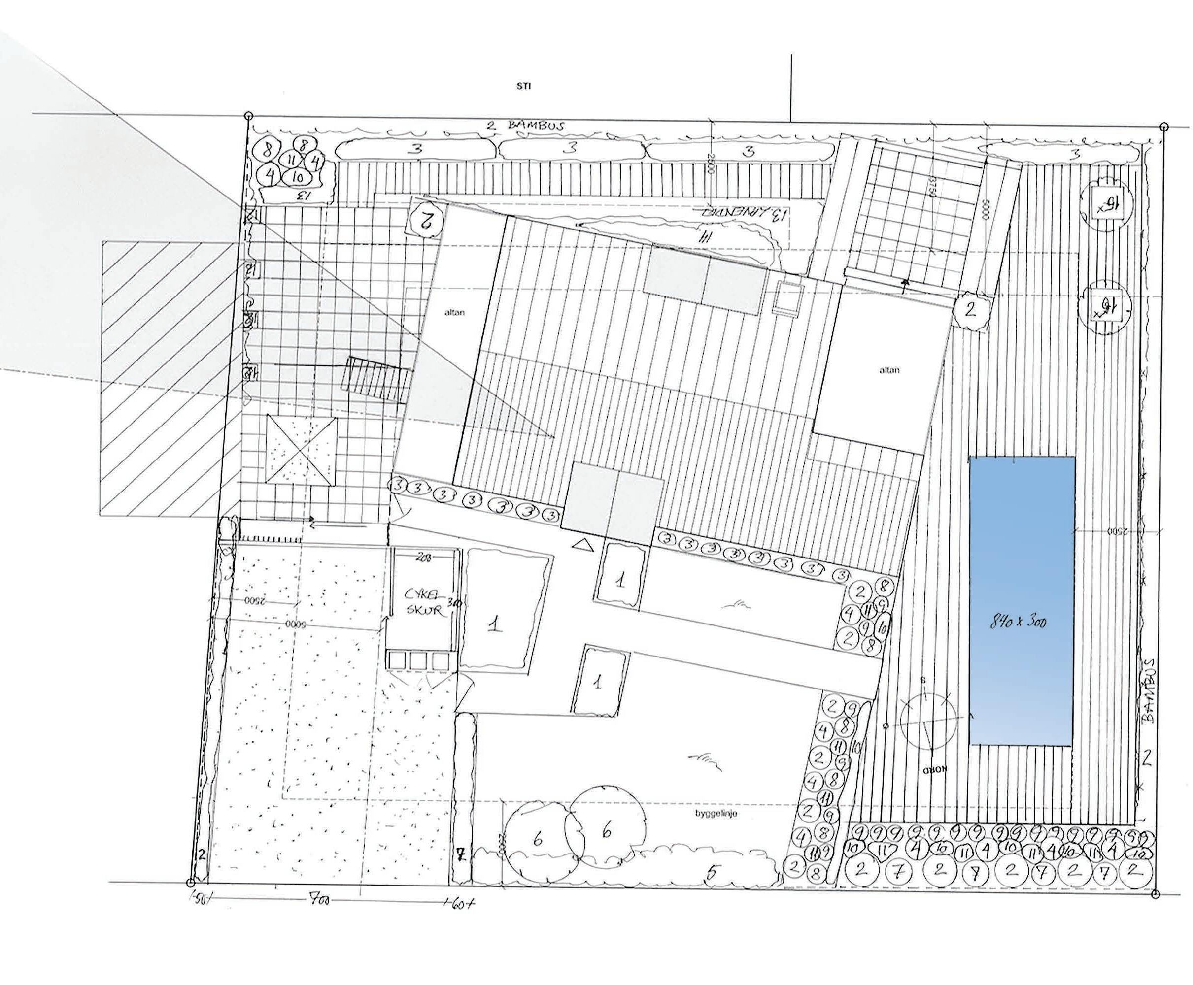 Skitse af Susanne Helbergs haveplan for familien, som ønskede en pool som et centralt samlingssted i deres have.