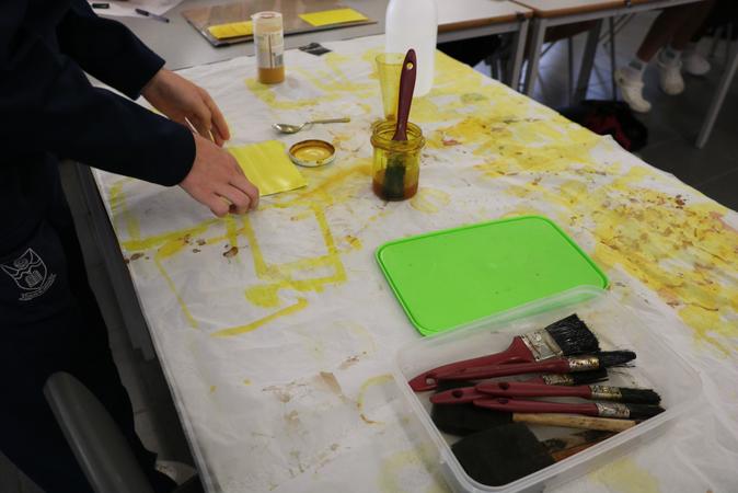 OnWednesday,ArtandPhotographystudentscompleted manyactivitiesrangingfrompinholephotographytoturmeric painting Studentsenjoyedlearninghowtomaketurmeric paintings;thisprocessinvolvedusingIsopropylalcohol,pinto canandinkjetpaper.Aftermixingtheseingredientsstudents wouldlayaleaforstencilonapieceofpaperandpaintthem intheformulaandleaveittodryinthesunfor45minutes For thepinholepaintingstudentshadJustinQuinnell,aworld famouspinholephotographyspecialist,givethematalkonhis work;healsotaughtthemhowtomakepinholephotographs Afterthetalkstudentswentandtooktheirownpinhole photographs.ArtandPhotographystudentsinyear7and8 weregiventhetaskofmakingtheirownstopmotionfilm.The studentswereputintoteamsandhadtomaketheirown background,stopmotioncharactersandeditandrecordtheir ownfilm.