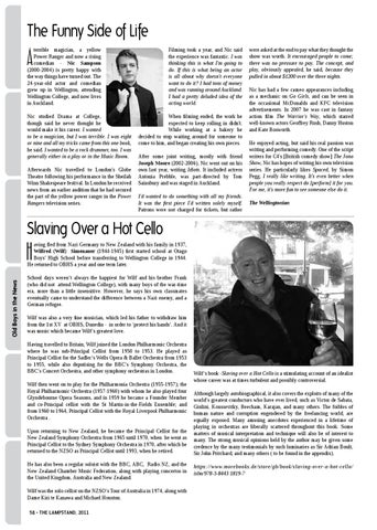 aving fled from Nazi Germany to New Zealand with his family in 1937, Wilfred (Wilf) Simenauer (1944-1945) first started school at Otago Boys’ High School before transferring to Wellington College in 1944. He returned to OBHS a year and one term later. School days weren’t always the happiest for Wilf and his brother Frank (who did not attend Wellington College), with many boys of the war-time era, more than a little insensitive. However, he says his own classmates eventually came to understand the difference between a Nazi enemy, and a German refugee. Wilf was also a very fine musician, which led his father to withdraw him from the 1st XV at OBHS, Dunedin - in order to ‘protect his hands’. And it was music which became Wilf’s greatest love. Having travelled to Britain, Wilf joined the London Philharmonic Orchestra where he was sub-Principal Cellist from 1950 to 1953. He played as Principal Cellist for the Sadler’s Wells Opera & Ballet Orchestra from 1953 to 1955, while also deputising for the BBC’s Symphony Orchestra, the BBC’s Concert Orchestra, and other symphony orchestras in London. Wilf then went on to play for the Philharmonia Orchestra (1955-1957); the Royal Philharmonic Orchestra (1957-1960) with whom he also played four Glyndebourne Opera Seasons, and in 1959 he became a Founder Member and co-Principal cellist with the St Martin-in-the-Fields Ensemble; and from 1960 to 1964, Principal Cellist with the Royal Liverpool Philharmonic Orchestra . Upon returning to New Zealand, he became the Principal Cellist for the New Zealand Symphony Orchestra from 1965 until 1970, when he went as Principal Cellist to the Sydney Symphony Orchestra in 1970, after which he returned to the NZSO as Principal Cellist until 1993, when he retired. He has also been a regular soloist with the BBC, ABC, Radio NZ, and the New Zealand Chamber Music Federation, along with playing concertos in the United Kingdom, Australia and New Zealand. Wilf was the solo cellist on the NZSO’s Tour of Australia in 1974, along with Dame Kiri te Kanawa and Michael Houston. 58 • THE LAMPSTAND, 2011