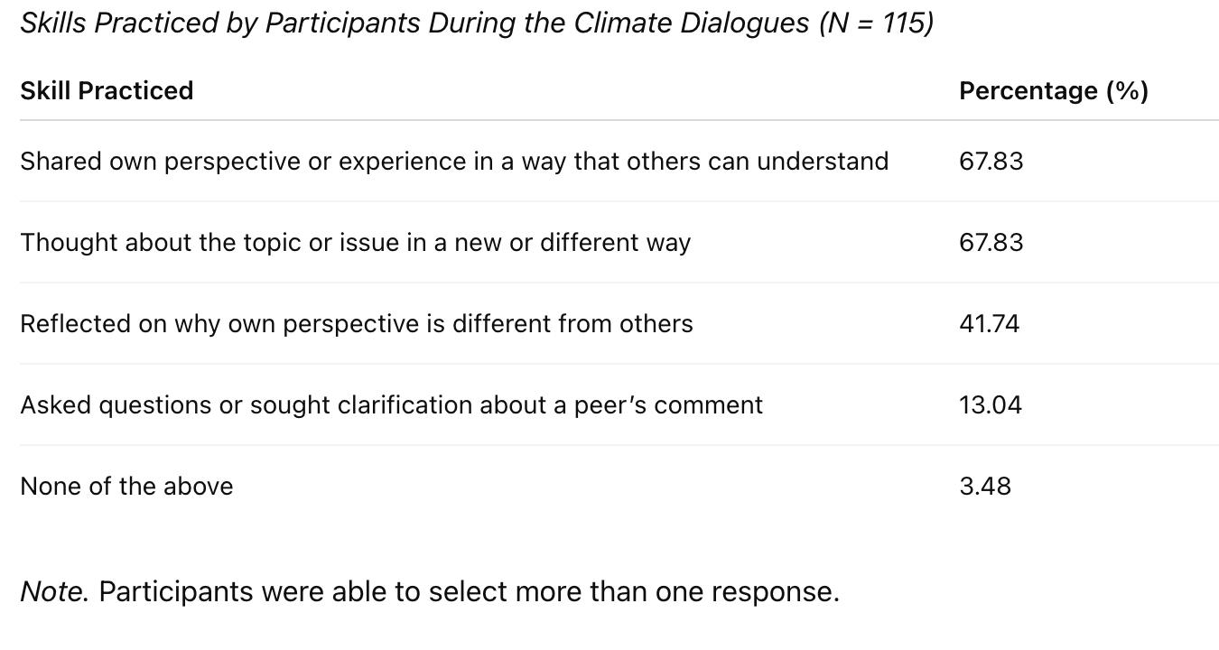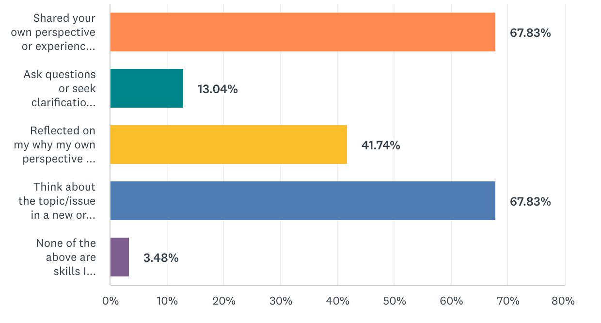 Participants were asked to identify the specific communication, reflection, or cognitive skills they practiced during the virtual dialogues. The data suggests that the dialogues successfully engaged participants in both perspective-sharing and critical thinking. A majority (68%) of respondents reported that they shared their own perspective or experience in a way that others could understand and 41.74% reflected on why their own perspective might differ from others, both indicating a high level of perspective-taking skills being practiced even during relatively short dialogue sessions (1 hour). A majority (68%) also reported that the dialogues helped them think about the topic or issue in a new or different way and a smaller but notable 13.04% reported that they actively asked questions or sought clarification about a peer's comment, both indicating that participants engaged in critical thinking during the dialogue. Only 3.48% stated that they did not practice any of the listed skills.