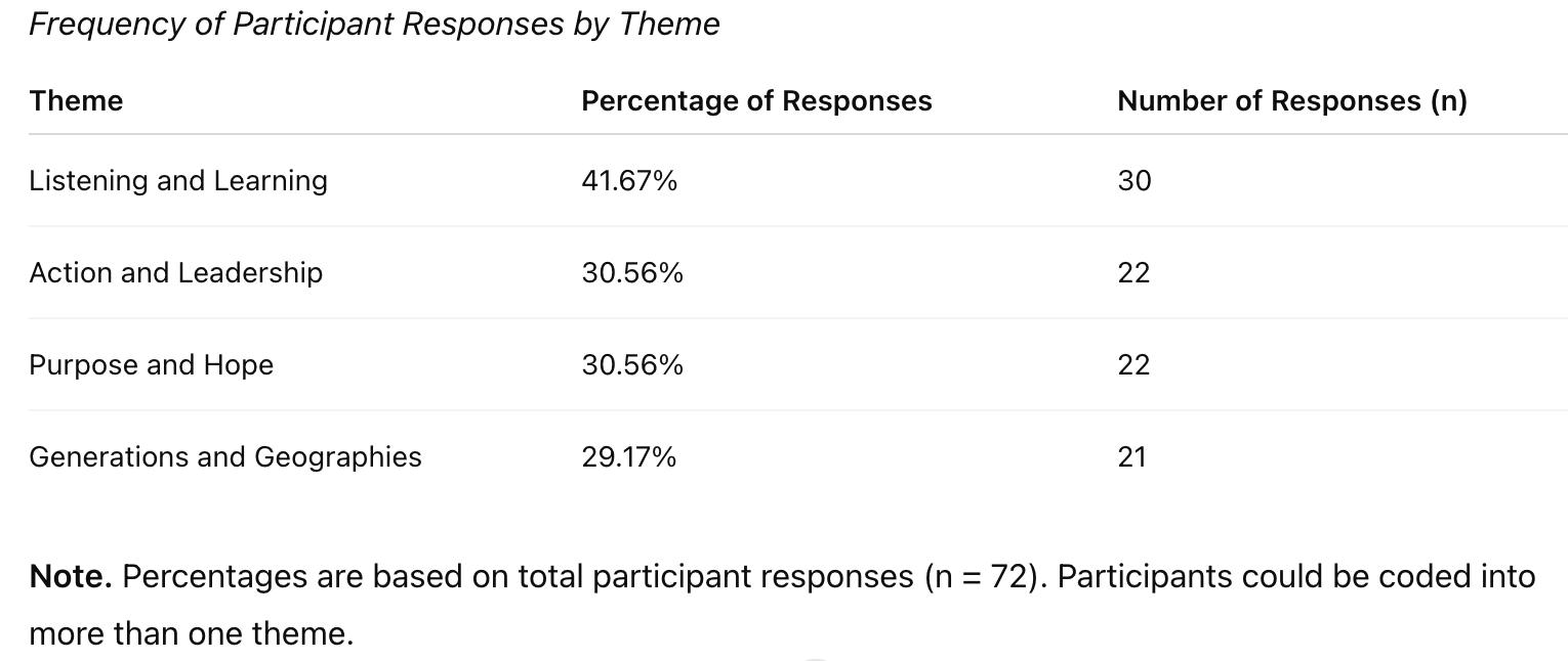 Qualitative analysis revealed four central themes that captured the experience: Listening and Learning, Generations and Geographies, Purpose and Hope, and Action and