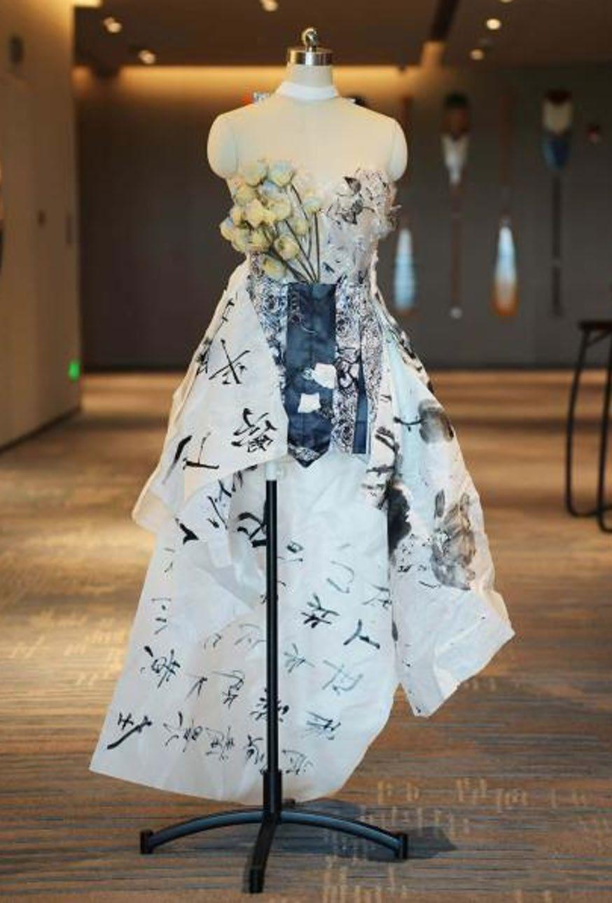 Drawing from traditional Chinese motifs, the students combine sustainability with cultural heritage. Their design pays tribute to classic blue-and-white porcelain, integrating hand-painted calligraphy into modern fashion. “We wanted to show that honoring tradition can also mean reimagining it sustainably,” they write. This piece was featured in the EcoFriendly Fashion Exhibition at the Tianjin Marriott Hotel.
