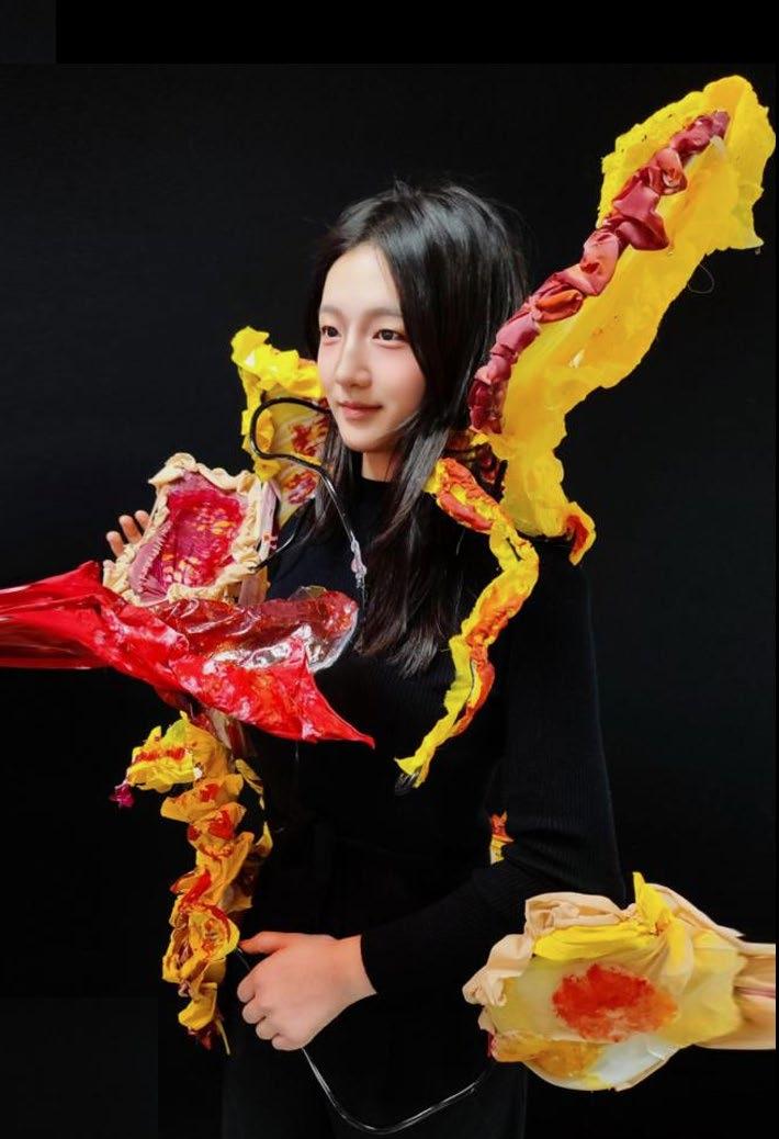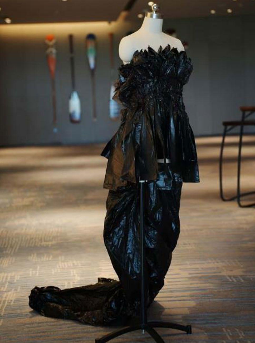 Jessica’s Garbage Queen redefines what is discarded. By constructing a full gown from bin bags, she challenges the viewer to reconsider the value of waste. Her design is both playful and provocative a reminder that creativity can emerge from what we throw away. This piece was featured in the EcoFriendly Fashion Exhibition at the Tianjin Marriott Hotel.