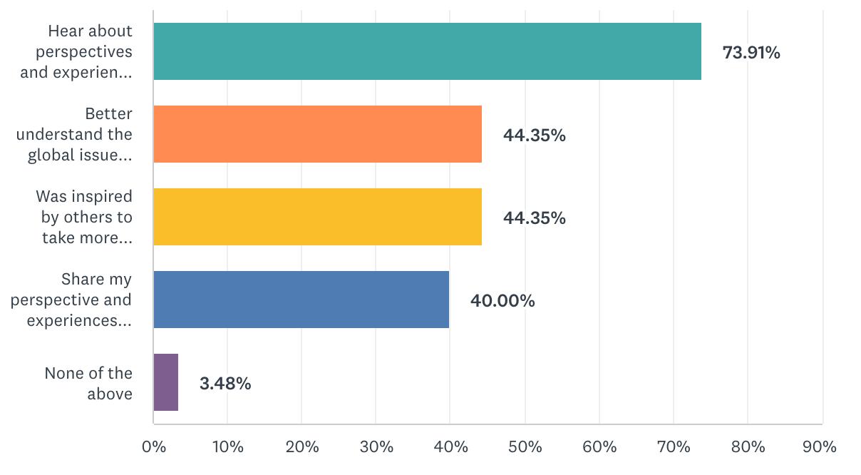 • Reported Impact: The single most impactful component identified by participants was the opportunity to hear about perspectives and experiences different from their own (73.91%). This exposure to diverse narratives across countries, cultures, and age groups was a key takeaway. Significantly, nearly half of respondents (44.35%) reported being inspired by others to take more action on climate issues and simultaneously gained a better understanding of the global issue being discussed.