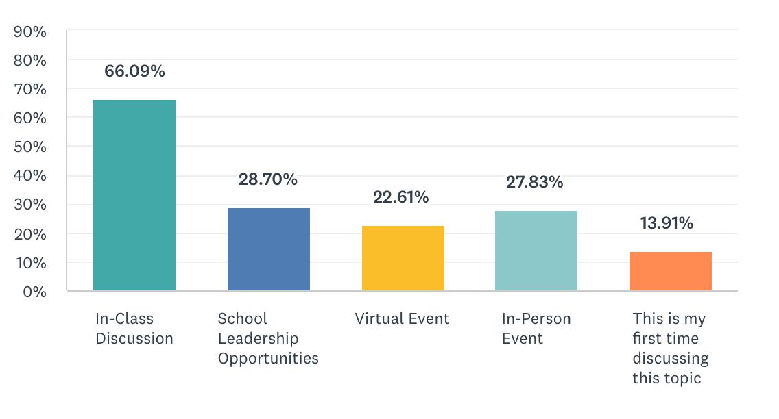 The participants reported a variety of previous experiences engaging with climate dialogue through their school (either as a student or educator), ranging from in-class discussions to student leadership opportunities to specific events. While a majority (86%) reported having some previous form of previous experience, most participants (61%) had no previous experience engaging in dialogue with participants from schools located in different countries.