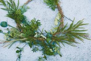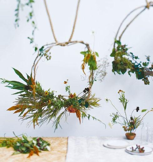 teressanten Gegenakzent. Sind Sie mit der Anordnung des Blattwerks zufrieden, beginnen Sie mit dem Einflechten der Blüten. Die mit den kräftigsten Stängeln kommen zuerst. Platzieren Sie sie – z. B. in Gruppen – dort, wo sie Ihrer Meinung nach am besten zur Geltung kommen, und verteilen Sie die übrigen Blüten sparsamer über den restlichen Kranz. Achten Sie darauf, in jeden Kranz zumindest einige Blüten einzuarbeiten. Blüten mit zarteren Stängeln am besten erst nach dem Aufhängen der Kränze hinzufügen. Sind die Blüten eingearbeitet, können Sie die Kränze aufhängen. Befestigen Sie dafür das Seil sicher an einem Balken oder Deckenhaken – sodass es sich nicht lösen kann, selbst wenn die Kränze schwingen. Ein mehrteiliges schwebendes Arrangement wirkt am besten, wenn die einzelnen Objekte auf verschiedenen Höhen hängen. Ziehen Sie das Seil durch den ersten Kranz, entscheiden Sie, in welcher Höhe er hängen soll, und fixieren Sie das Seil am Balken oder Haken. Das Seilende durch den nächsten Kranz fädeln und an der zweiten Halterung befestigen. Fahren Sie auf diese Weise fort, bis alle Kränze aufgehängt sind.