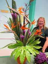 Large green chrysanthemum blooms and pink penstimons were the feature flowers in a design on a wrought iron stand 1980s style. For her final design to avoid using floral foam Beverley used a terracotta vase to hold a range of garden foliage to support tropical strelitzias and purple liatris. Pat Squire gave the vote of thanks and Jenny Bodenham and Sandra Gibby served the teas.