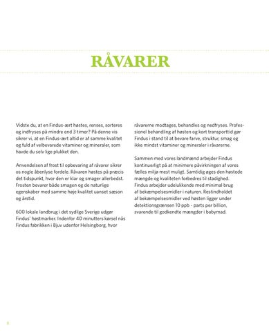 råvarerne modtages, behandles og nedfryses. Professionel behandling af høsten og kort transporttid gør Findus i stand til at bevare farve, struktur, smag og ikke mindst vitaminer og mineraler i råvarerne. Sammen med vores landmænd arbejder Findus kontinuerligt på at minimere påvirkningen af vores fælles miljø mest muligt. Samtidig øges den høstede mængde og kvaliteten forbedres til stadighed. Findus arbejder udelukkende med minimal brug af bekæmpelsesmidler i naturen. Restindholdet af bekæmpelsesmidler ved høsten ligger under detektionsgrænsen 10 ppb - parts per billion, svarende til godkendte mængder i babymad.