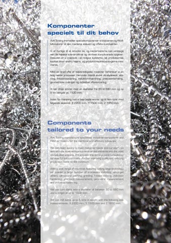 Komponenter specielt til dit behov AVK Tooling fremstiller specialkomponenter til industrien og PAMluftmotorer til den maritime industri og offshore-industrien. Vi er hurtige til at omstille os, og medarbejderne kan varetage selv de højeste tolerancekrav og de mest komplicerede opgaver. Desuden er vi trænede i at rådgive kunderne, så produkternes kvalitet bliver endnu højere, og produktionsomkostningerne minimeres. Med en bred vifte af højteknologiske maskiner behersker vi en lang række processer. Herunder blandt andet ultralydsvask, slibning, friktionssvejsning, induktionshærdning, præcisionsmåling, geometriske målinger og individuel afbalancering. Vi kan dreje emner med en diameter fra 20 til 680 mm og op til en længde på 1500 mm. Inden for fræsning kan vi bearbejde emner op til fem tons med følgende aksemål: X 2200 mm, Y 1500 mm, Z 1850 mm.