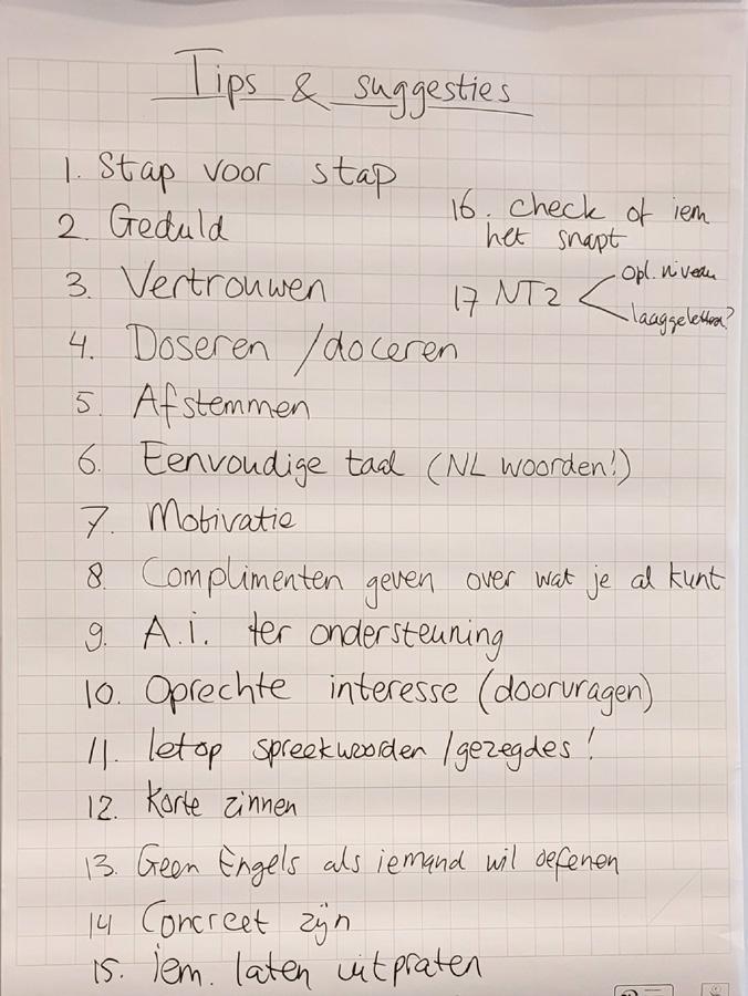 “Na de start van zijn opleiding MBO niveau 2 loopt hij al gauw tegen problemen aan. Want naast dat de opleiding niet is aangepast voor anderstaligen, is de hele cultuur in Nederland zó anders. Hij is in Eritrea naar school geweest, maar termen als ‘feedback geven’ en ‘doelen stellen’ kent hij niet. Ze zijn gewend om overal ‘ja’ op te zeggen. Het is dan de vraag of ze het echt begrepen hebben. Een agenda heeft hij niet, Mo onthoudt alles in zijn hoofd. Door wekelijks bij elkaar te komen krijgt hij langzamerhand toch wat dingen van de Nederlandse cultuur mee. Ik ben ook mee geweest naar een tien minutengesprek op de school van de dochter. Zijn vrouw was er nog nooit geweest en zou mij nooit om hulp vragen. Een nieuwsbrief van school lezen? Begin er maar eens aan als je zelf nooit hebt leren lezen en schrijven. En woorden als ‘aannemen’ en ‘opnemen’ klinken in onze oren zo vanzelfsprekend, maar hebben ook een figuurlijke betekenis. En dat maakt het moeilijk om uit te leggen.”