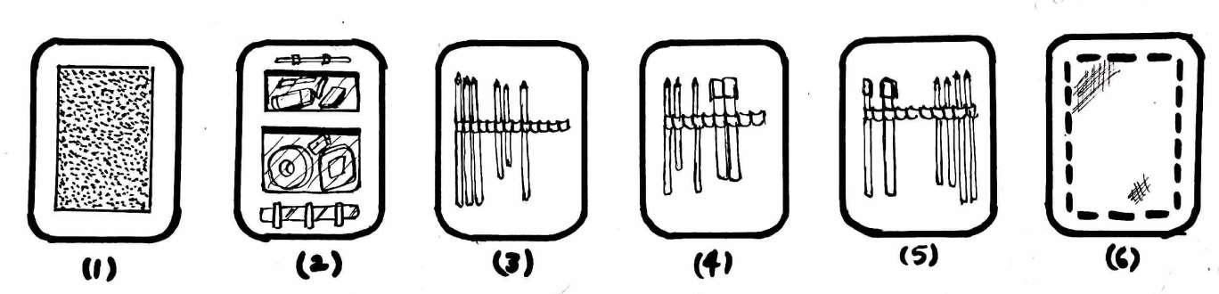 These are the six different faces of the pouch which represents - first one is the detachable area in the first face. On the second face is the solid stationary like a erasers, tapes etc. and third, fourth, fifth are faces for pens and sketches etc. And in the last face is the main face which faces front part the bag and gives an aesthetic look to the bag.