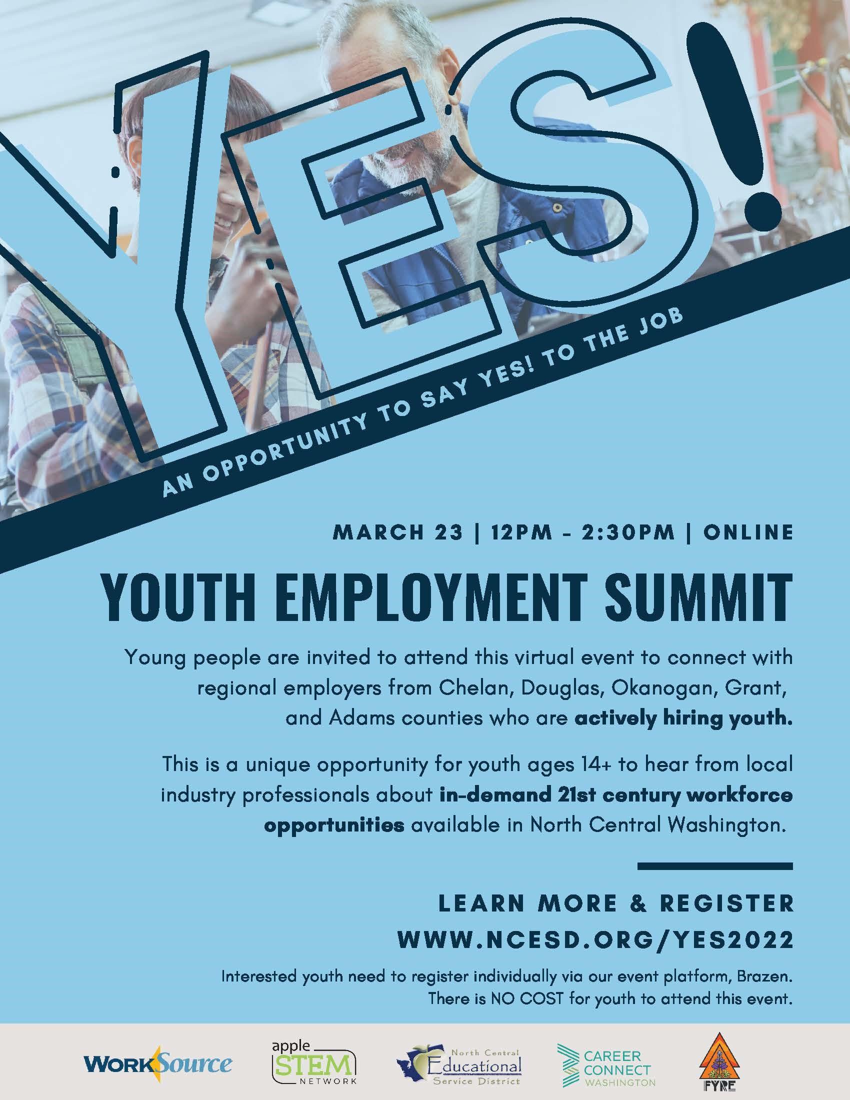 YOUTH EMPLOYMENT SUMMIT A P R I L 1 2 | 1 2 P M - 3 : 0 0 P M | O N L I N E Young people are invited to attend this virtual event to connect with regional employers from Chelan, Douglas, Grant, and Okanogan counties who are actively hiring youth. This is a unique opportunity for youth ages 14+ to hear from local industry professionals about in-demand 21st century workforce opportunities available in North Central Washington. L E A R N M O R E & R E G I S T E R W W W . N C E S D . O R G / E V E N T / Y E S 2 0 2 3