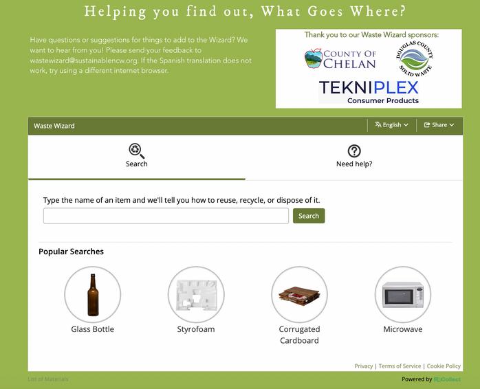 The Waste Wizard online search tool, launched in April 2022, is a comprehensive, bilingual guide for reducing waste through reusing, donating, recycling and composting in Chelan and Douglas counties.
