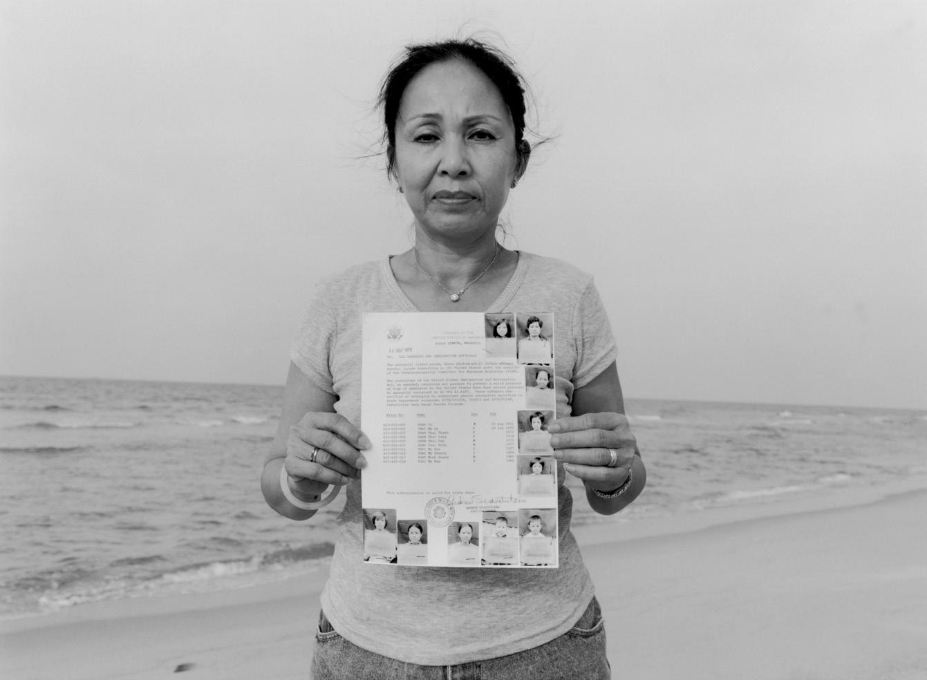 Binh Danh’s mother holding the immigration document that allowed them entrance as refugees into the United States in 1979.