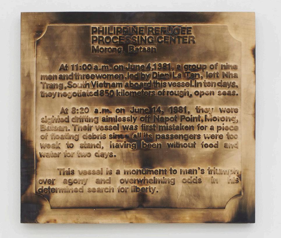 Binh Danh was born in a Southern Vietnamese fishing village two years after the end of the Vietnam War. When Danh was a toddler, his family was among the “boat people” who fled the country and relocated from a refugee camp in Malaysia to San Jose, California. The artist invented the chlorophyll printing process, in which photographic images appear embedded in leaves through photosynthesis. The leaves are then cast in resin, like biological samples for scientific studies. This process deals with the idea of elemental transmigration: the decomposition and composition of matter into other forms. Danh’s images of war are part of the leaves and live inside and outside of them. The leaves express the continuum of war, and they contain the residue of the Vietnam War: bombs, blood, sweat, tears, and metals. The dead have been incorporated into the landscape of Vietnam during the cycles of birth, life, and death. As matter is neither created nor destroyed, but only transformed, the remnants of the war live on forever in the Vietnamese landscape.