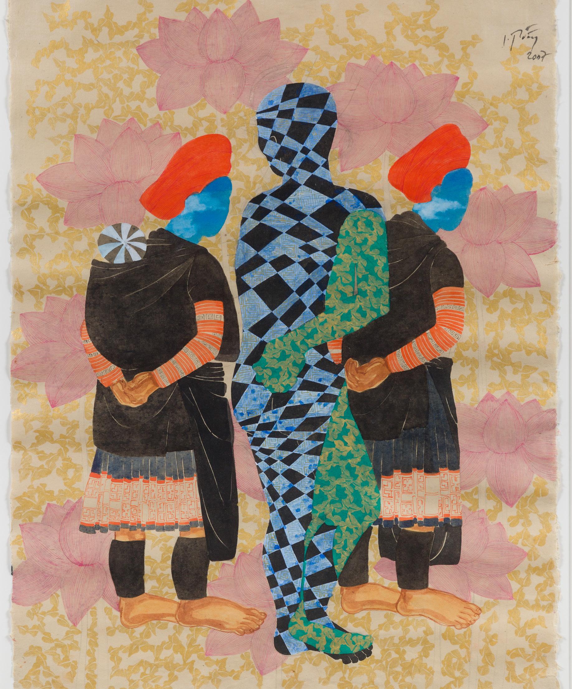 Poong’s art focuses on balance in the environment, life’s transitions, and women’s role in society. In this painting, the central figure is a contemporary woman, possibly the artist herself, who looks back on her H’Mong heritage represented by two mothers, each with a child on their back. Poong employs several symbols: a checkerboard pattern represents balance in life between the modern and the traditional, between nature and humanity; sky faces are evidence of the figures being attuned to their environment, their large bare feet showing their link to the earth; and lotuses as signs of femininity and of Buddhist transformation.