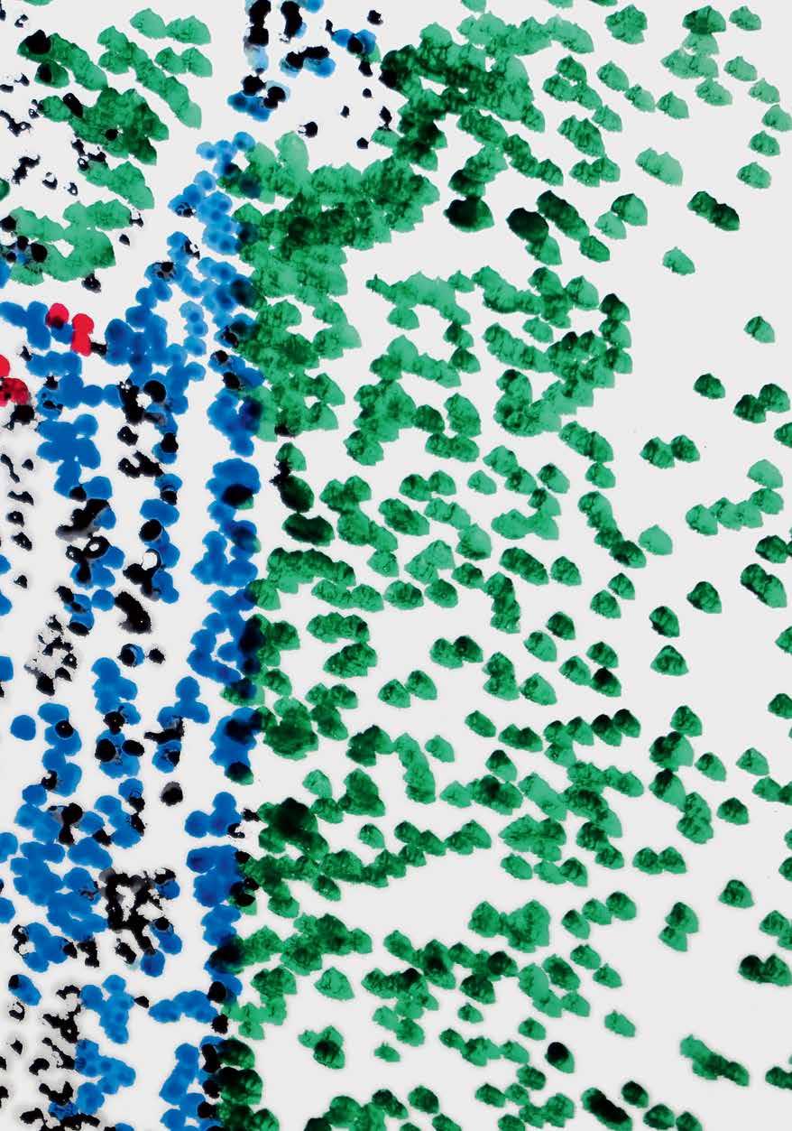 [following spread] Liat Segal, Hyperreality image abstractization process (high-resolution image reduced into a collection of digital dots and flattened to a palette of a few basic colors via custom-made painting machine), 2024, Israel