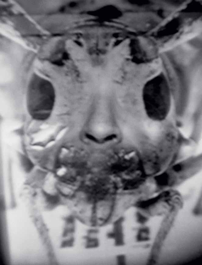 The Japanese company Minolta began manufacturing its Montage Unit in the 1950s to assist in the identification and facial reconstruction of victims of the atomic bomb on Hiroshima. Its analogue mirror technique combines fragments from up to four portraits, each the size of a passport photograph, creating a single image, a so-called phantom image. Police forces in Japan and the United States subsequently used the Minolta Montage Unit to identify suspects. Its use became standard procedure in West German police departments at the time of the Baader-Meinhof terror attacks, beginning in the 1970s. While police-produced phantom images rely on mugshots of arrested persons, Lang, working with the detective, used photos of all the residents of his home village in Germany, Schloss-Nauses, along with photos of insects, primates, owls, and other animals.
