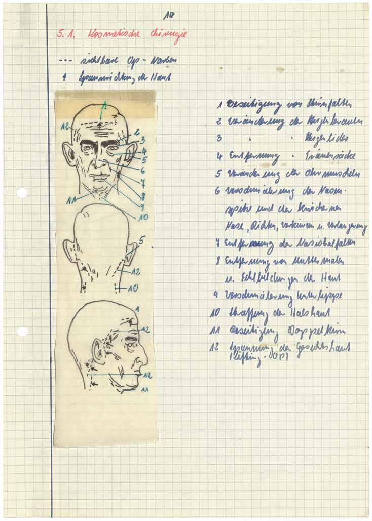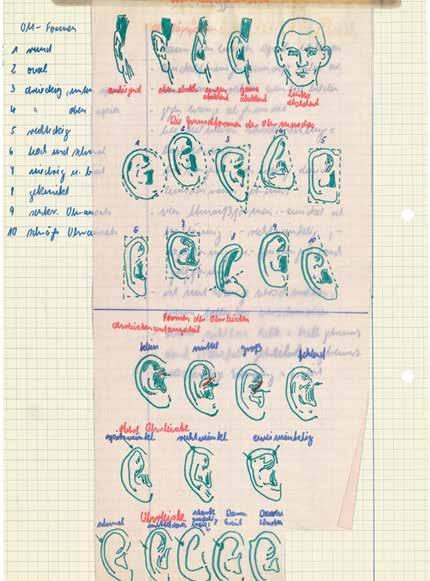 between East and West Berlin, where highly trained East German border guards monitored incoming and outgoing traffic. This archive contains a wealth of analog facial recognition training materials used at the checkpoint in the 1970s and ’80s. Among them are manuals and drawings designed to help border guards develop an “expert gaze,” capable of seeing through disguises and identifying forged passports.