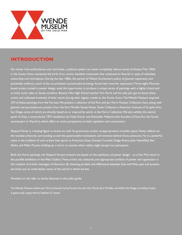 INTRODUCTION No matter how authoritarian and restrictive, a political system can never completely silence voices of dissent. The 1950s in the Soviet Union witnessed the birth of an artistic dissident movement that continued to flourish in spite of relentless censorship and intimidation. During the late 1980s, the period of Mikhail Gorbachev’s policy of glasnost (openness) and perestroika (reform), much of the accumulated countercultural energy found new room for expression. Thirty-eight Moscowbased artists, trained in poster design, used the opportunity to produce a unique series of paintings with a highly critical and at times ironic take on Soviet socialism. Beverly Hills High School teacher Tom Ferris and his wife, Jeri, got to know these artists and collected hundreds of their works during their regular travels to the Soviet Union. The Wende Museum acquired 234 of these paintings from the Ferrises. We present a selection of the Tom and Jeri Ferris Russian Collection here, along with glasnost and perestroika-era posters from the Ron Miriello Soviet Poster Show Collection | American Institute of Graphic Arts, San Diego, some of which are directly based on or inspired by works in the Ferris Collection. We also exhibit the central panel of Unity, a monumental 1993 installation by Vitaly Komar and Alexander Melamid (the founders of Sots Art, the Soviet counterpart to Pop Art), which offers an ironic perspective on both capitalism and communism. Shepard Fairey is a leading figure in street art, with his grassroots, artistic re-appropriation of public space. Fairey reflects on the societal pressures surrounding us and the questionable motivations and interests behind those pressures. He is a powerful voice in the tradition of such artistic free spirits as Francisco Goya, Gustave Courbet, Diego Rivera, John Heartfield, Ben Shahn, and Pablo Picasso, holding up a mirror to society when reality might escape our perception. Both the Ferris paintings and Shepard Fairey’s artwork are based on the aesthetics of poster design – as is Sun Mu’s work in the parallel exhibition in the West Gallery. These artists use, interpret, and appropriate symbols of power and oppression in the creation of artistic messages of liberation. By showing parallels and differences between East and West, past and present, we invite you to make better sense of the world in which we live. Numbers in red refer to works featured in the audio guide. The Wende Museum thanks Jeri Ferris, Amanda Fairey,Victoria Yarnish, Dan Flores, Ron Miriello, and AIGA San Diego. Crumbling Empire is generously supported by Stephen O. Lesser.