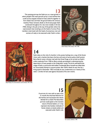 This painting portrays the Stalin era as a meat grinder in which people’s lives were ground up by a cruel machine that could not be stopped. Instead of meat, skulls fit together to form Stalin’s face and litter the ground below the ominous machine. These remnants allude to the brutal purges Stalin conducted throughout his rule, most notably in the late 1930s. Sitting in the pile at the top of the grinder, where the unprocessed meat would go, are the heads of various Party members intermixed with the heads of anonymous men and women, all ready to be executed under Stalin’s orders.