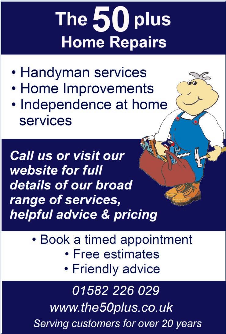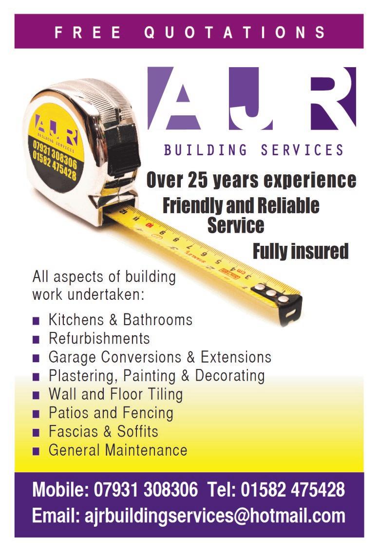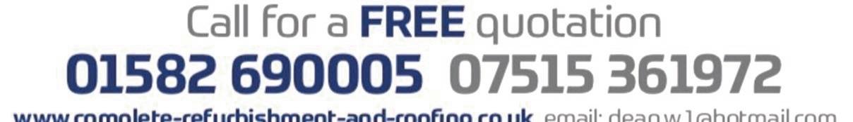 Blocked WC’s, Sinks, Baths and Basins ● Repair/Renew Stopcocks and Taps ● Plumb in Washing Machines and Dishwashers ● Repair Leaking Pipes ● Outside Taps ● Complete Bathroom, Cloakroom, Shower Room and Kitchen Installations ● Local Family Run Business, Over 35 Years Experience ● Honest and Reliable Service ● Free Consultation/ Quotation for all Enquiries Dean Herrington 07830 159010 01727 764217 info@djmplumbing.co.uk www.djmplumbing.co.uk Wishing all our Clients a Happy and Healthy New Year DJ&M PLUMBING SERVICES LTD Tiling Plastering Electrical Discounts on all Bathrooms & Kitchens Supplied