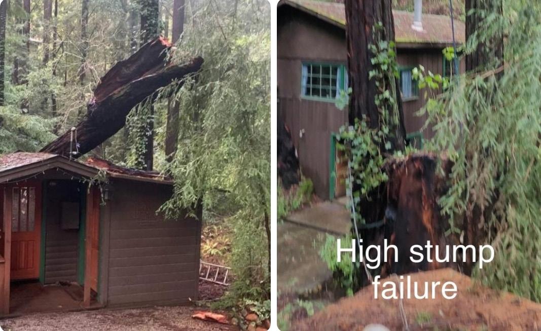 to keep you and yours safer, and some simple steps on how to spot obvious signs of potential tree failure and other hazards caused by trees that we live with every day here in the San Lorenzo Valley. One of the beautiful trees we get the pleasure of living with here in Santa Cruz county are Coastal Redwoods, (Sequoia sempervirens). But like everything good there is some cost to living under these giants. Redwood trees are prone to losing their branches regularly throughout the year. These branches are called “widow makers” by the old-timers for a good reason. Rubbing or crossed branches are often the culprits. They can fall at any time. Sometimes they get “hung up” on their way down and don’t make it to the ground. This causes a hazard to you, your roof, etc. “the target”. Hung up branches are usually easier to spot from a distance. So stand back and visually inspect your Redwood trees often to prevent targets from being struck.