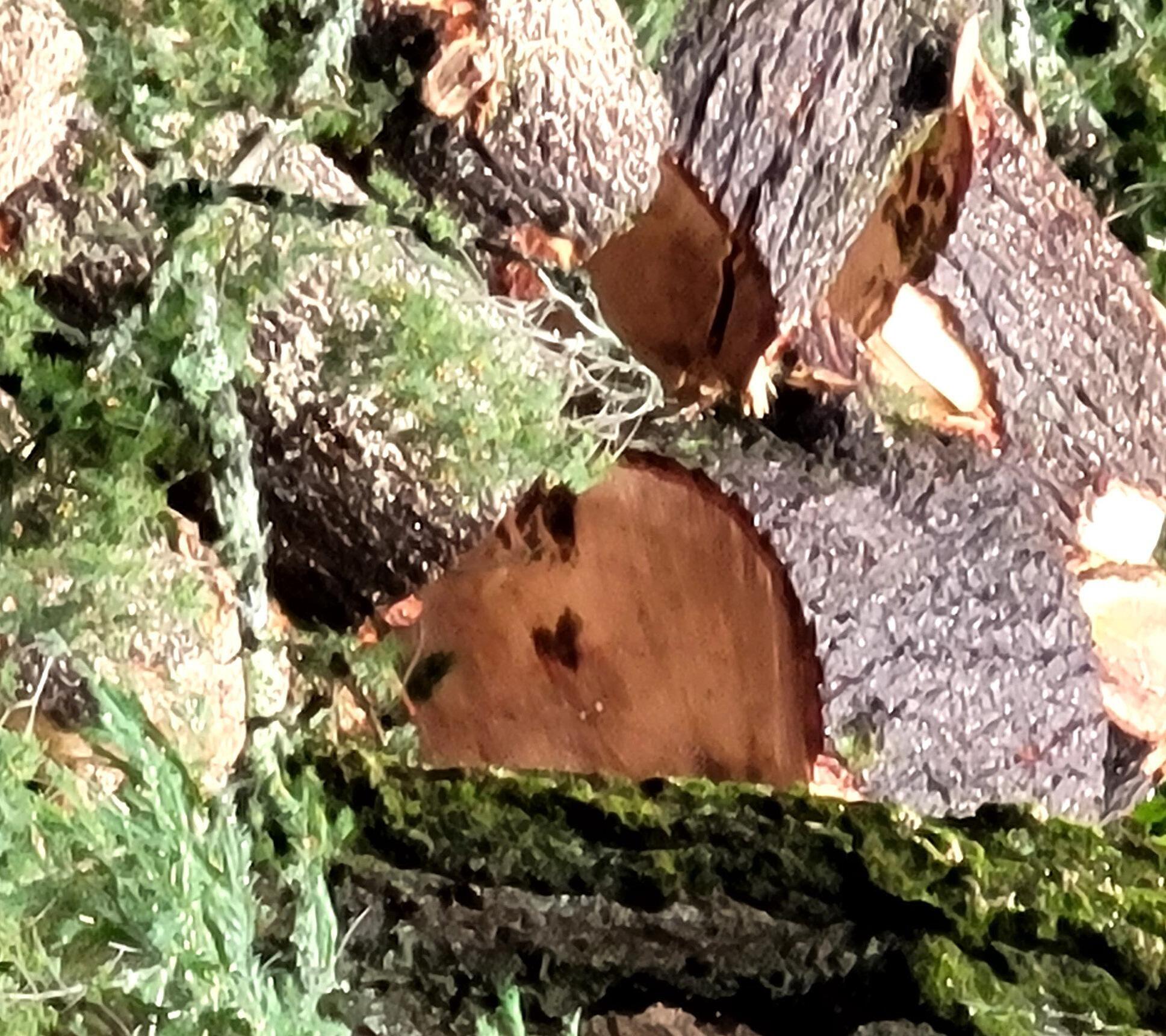 Then, as the worker cut the next 4 foot section of the treetop, a brilliant magenta pink color surrounded the tree’s top section. I first thought it was a reflection from the clouds behind, but a quickly snapped photo showed what I was seeing. It was around the treetop, not behind it. Then the surrounding green of the forest heightened and became an iridescent brilliant glowing green. This too, I thought my imagination. The four foot section plummeted, slammed to the ground landing hard, only to reveal a dark heart in the core of the tree. It was as if all the heart and love people around me had been sending to the trees not to fall on my home, manifested in its core. Then there was a sense of the ground rising a bit and duff sort of shaking, as if the roots of the tree were shaking themselves off. There was a sudden quiet, silence and then a “whoosh”. I could have sworn I saw the tree’s spirit disengage the physical form and go off into the forest. This too, I caught in a photo. There definitely was a disturbance in the force of the forest.