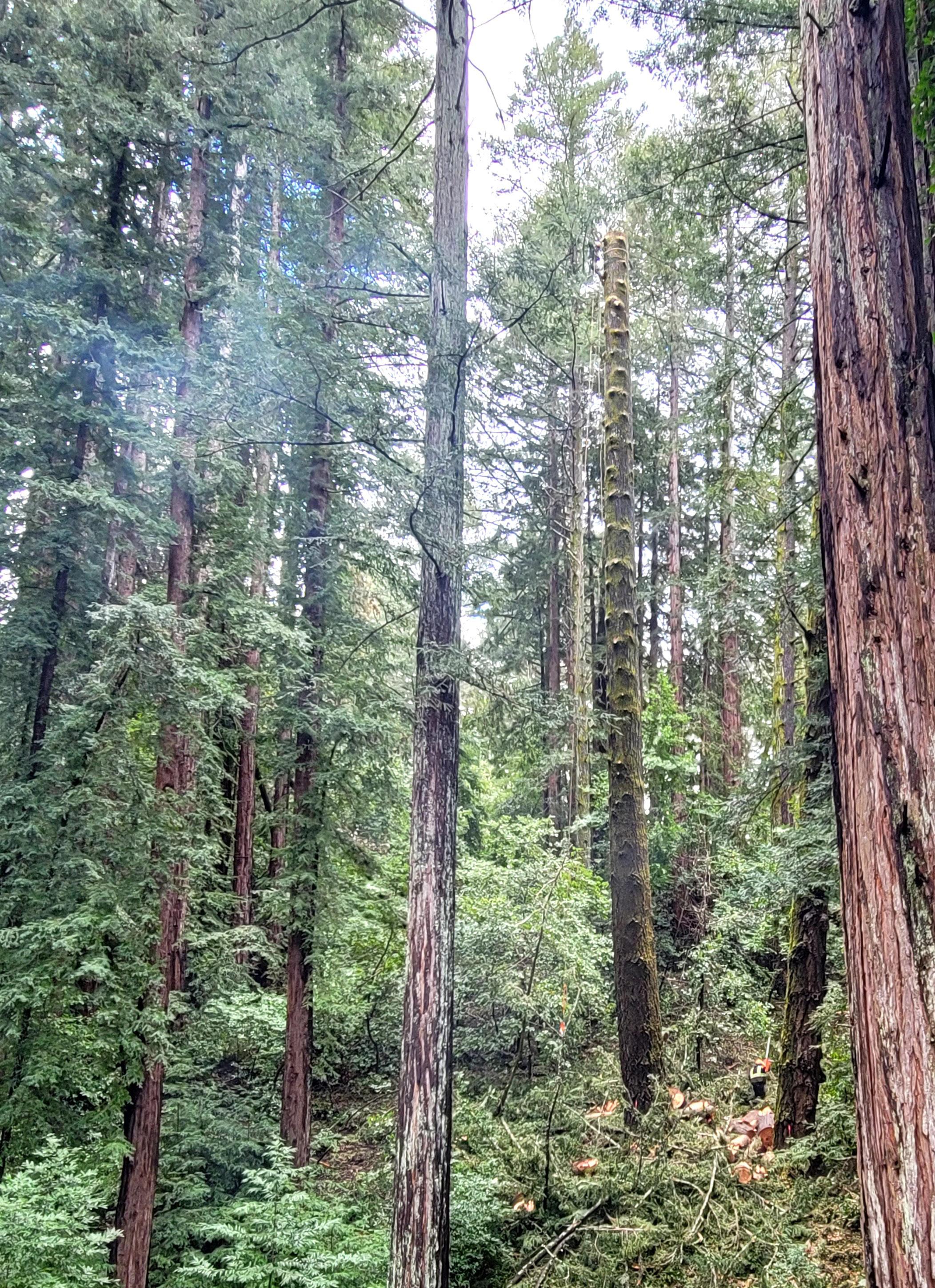 The tree crew arrived and got right to work on these monster trees, 250 feet tall, towering above all other redwoods nearby. I watched from across the creek, my heart heavier with each cut. The limbs plummeted down like enormous javelins, stabbing the mushy soggy ground and snapping in all directions. When the top of the tree was finally cut, it fell to the ground like an old, discarded Christmas tree. It was breezy and the other surrounding trees appeared to begin crying in the wind, squeaking, and groaning with each cut. There seemed to be a collective tree consciousness, and they too seemed to feel the sadness I was
