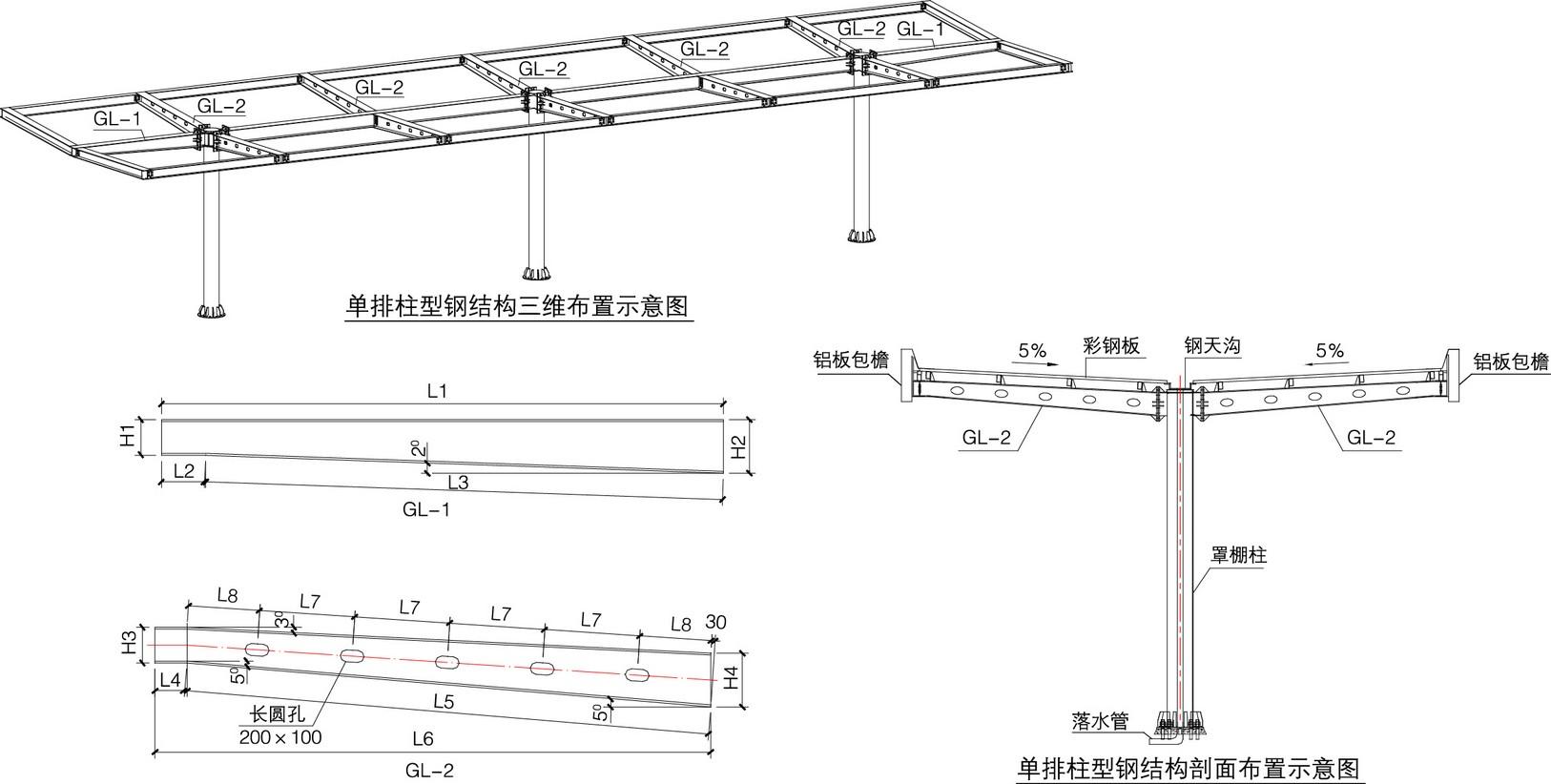Single-row single-pillar through-type steel structure canopy plan layout Sectional view of single-row single-pillar throughtype steel structure canopy