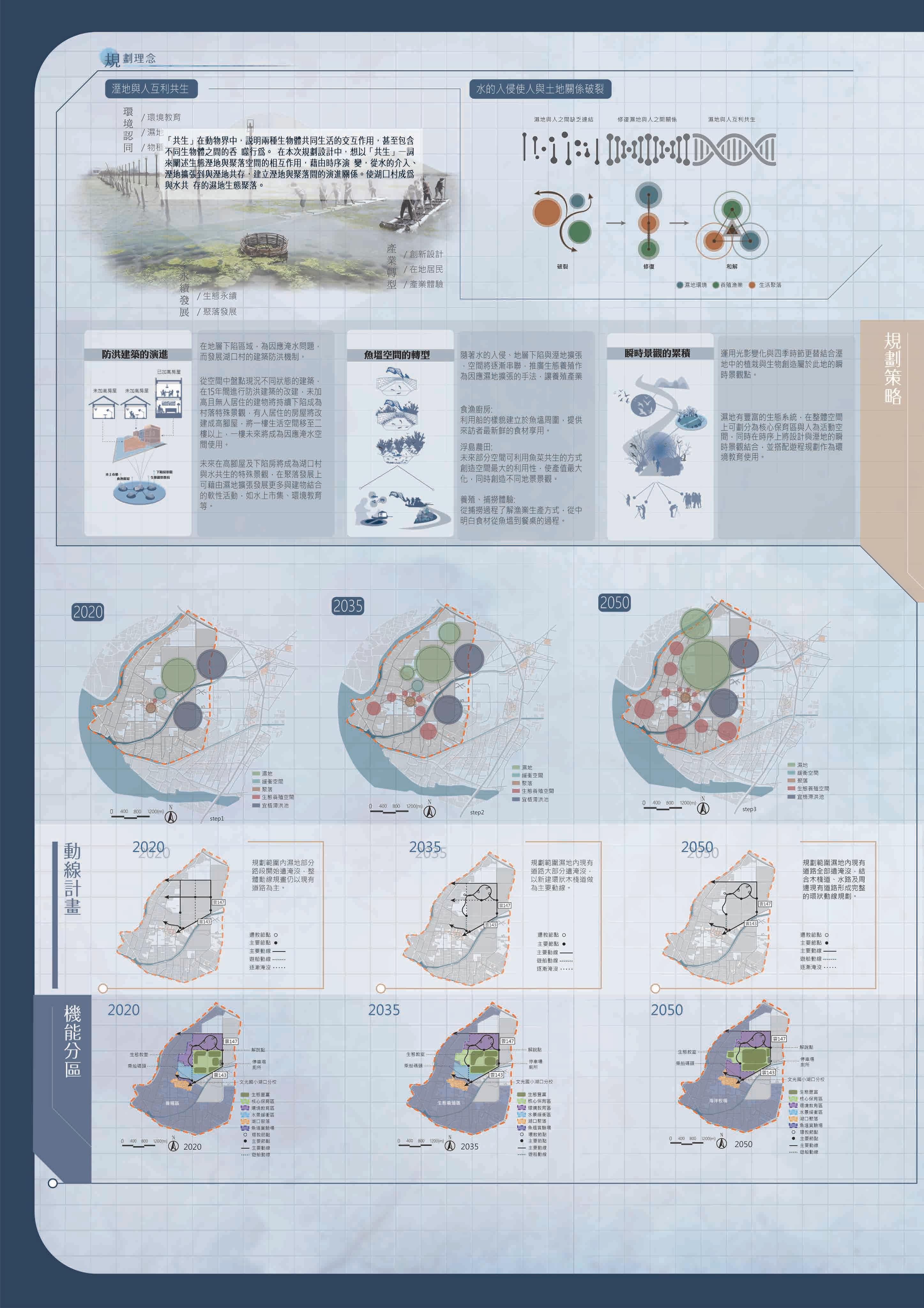 湖鄉湖口村亦是此大環境下逐漸沒落的漁村 之一。 水的入侵使人與土地的關係破裂,而我們要 做的,是修復的過程。 「共生」在動物界中,說明兩種生物體共同 生活的交互作用,甚至包含不同生物體之間 的吞噬行為。 在本次規劃設計中,想以「共生」一詞來闡 述生態溼地與聚落空間的相互作用,藉由時 序演變,從水的介入、溼地擴張到與溼地共 存,建立溼地與聚落間的演進關係。使湖口 村成為與水共存的濕地生態聚落。 工作分配: 黃詩詠-小圖製作、圖面排版、平面 圖CAD繪製、P圖製作、PPT製作 陳益-小圖製作、報告書編排、平面 圖CAD繪製、PPT製作、建模 黃 詩詠 陳 益 島田上的青舟 與水共生-湖口聚落 議題探討 規劃理念 指導老師:阮琴閔