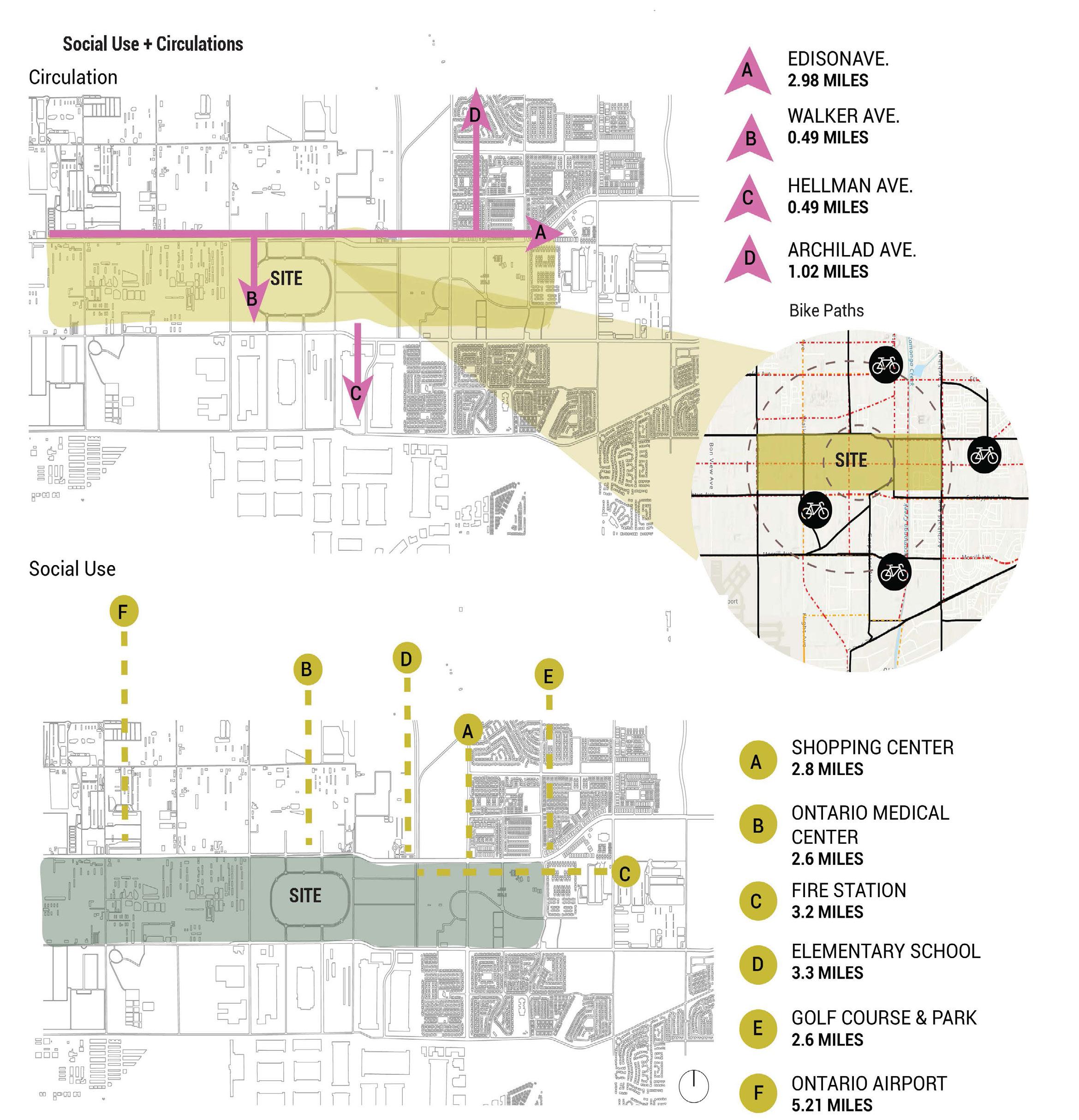 The Communal Space allows for mobility to get through the community as well as a Bioswale to capture excess rain water, with space for one to bike around enjoying the scenery of the green space with a park through the middle filled with nodes and shops to enjoy a afternoon in Ontario.