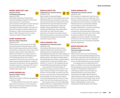 Appointed: 2013 Chris was born in Goodwood in Cape Town and grew up in Bishop Lavis on the Cape Flats. Chris has been involved extensively in the development and upliftment of communities as a minister in the Presbyterian Church, and has been politically active, formally as well as informally. He has managerial experience in a number of businesses, and, as a non- executive director, has led empowerment and transformation proactively at a number of listed companies. He is a former MEC for Economic Affairs for the Western Cape Legislature and former president of the Chamber of Commerce. He is the chairman of Ascension Properties and serves on the boards of Standard Bank and Woolworths.