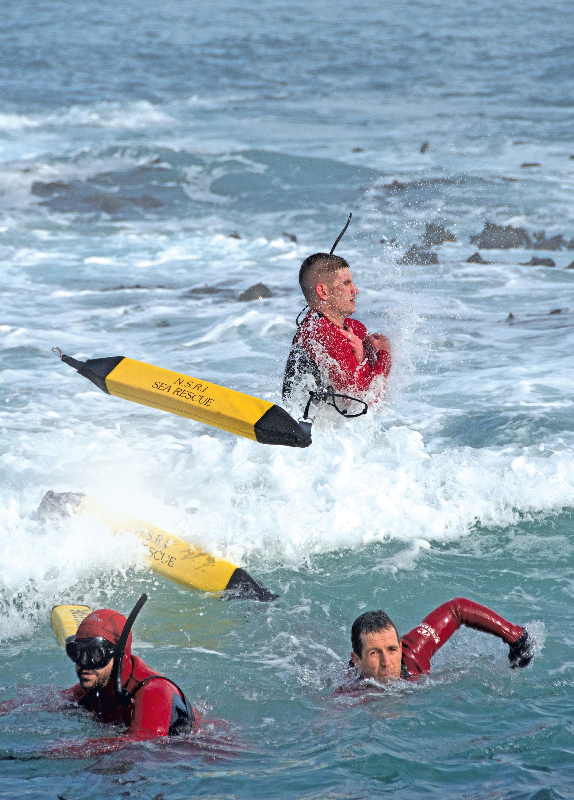 the surf, sometimes entering from rocky shorelines and needing to navigate strong rip currents to get to casualties. Strength and fitness are essential.