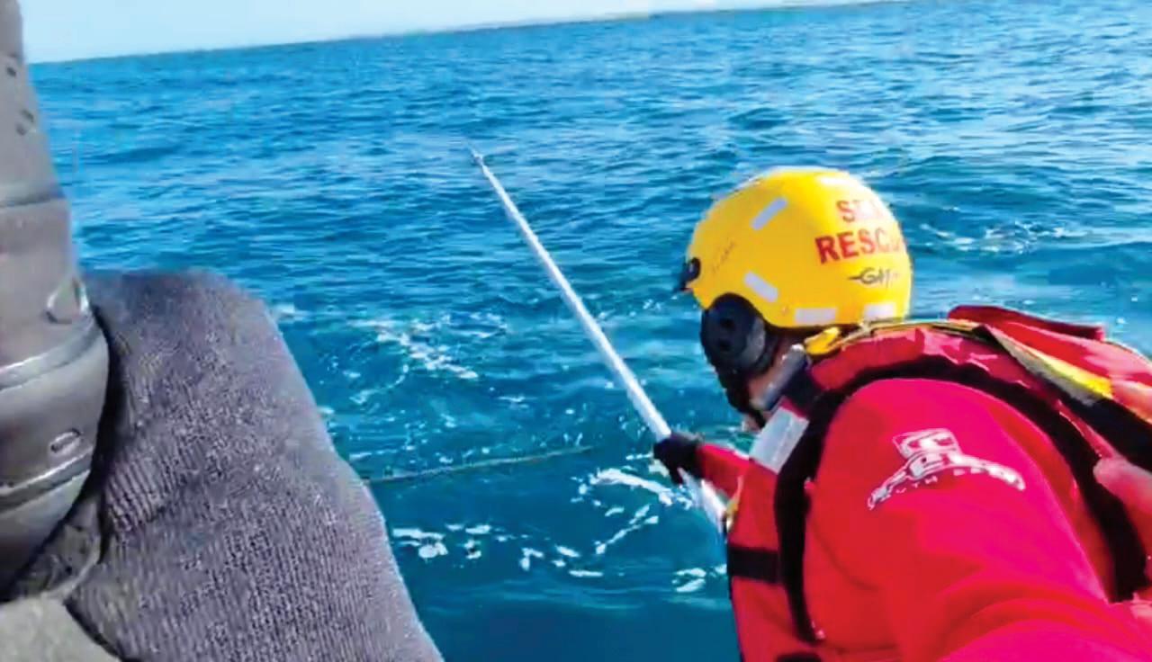 The long trailing rope made it difficult for the NSRI vessel to approach without getting it entangled in their props, so the decision was made to systematically shorten the rope by cutting it off in sections. This went well until the whale suddenly surged ahead, pulling the cutting pole out of Michael’s hands.
