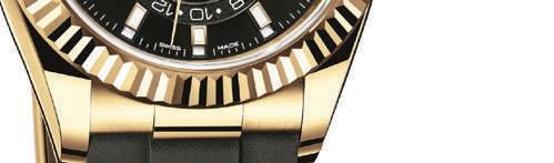 This Oyster Perpetual SkyDweller in 18ct yellow gold is the fi rst in the Classic category to be paired with the innovative high-performance elastomer Oysterfl ex bracelet. It is fi tted with an Oysterclasp and features the Rolex Glidelock extension system for extra comfort. The Oyster Perpetual SkyDweller features a bright black dial with sunburst fi nish, 18ct yellow-gold hands and indexes, the fl uted rotating bezel specifi c to the line, and 42mm Oyster case. This version is equipped with caliber 9001, at the forefront of watchmaking technology.