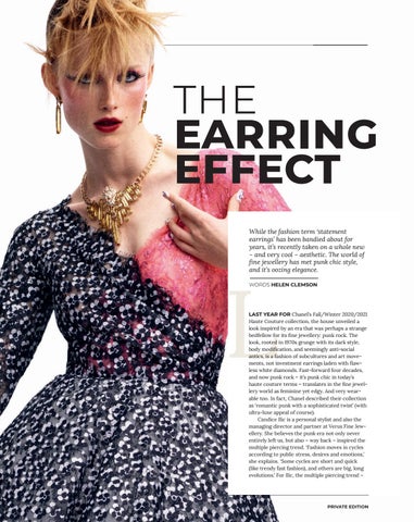 LAST YEAR FOR Chanel’s Fall/Winter 2020/2021 Haute Couture collection, the house unveiled a look inspired by an era that was perhaps a strange bedfellow for its fine jewellery: punk rock. The look, rooted in 1970s grunge with its dark style, body modification, and seemingly anti-social antics, is a fashion of subcultures and art movements, not investment earrings laden with flawless white diamonds. Fast-forward four decades, and now punk rock – it’s punk chic in today’s haute couture terms – translates in the fine jewellery world as feminine yet edgy. And very wearable too. In fact, Chanel described their collection as ‘romantic punk with a sophisticated twist’ (with ultra-luxe appeal of course). Candice Ilic is a personal stylist and also the managing director and partner at Verus Fine Jewellery. She believes the punk era not only never entirely left us, but also – way back – inspired the multiple piercing trend. ‘Fashion moves in cycles according to public stress, desires and emotions,’ she explains. ‘Some cycles are short and quick (like trendy fast fashion), and others are big, long evolutions.’ For Ilic, the multiple piercing trend –