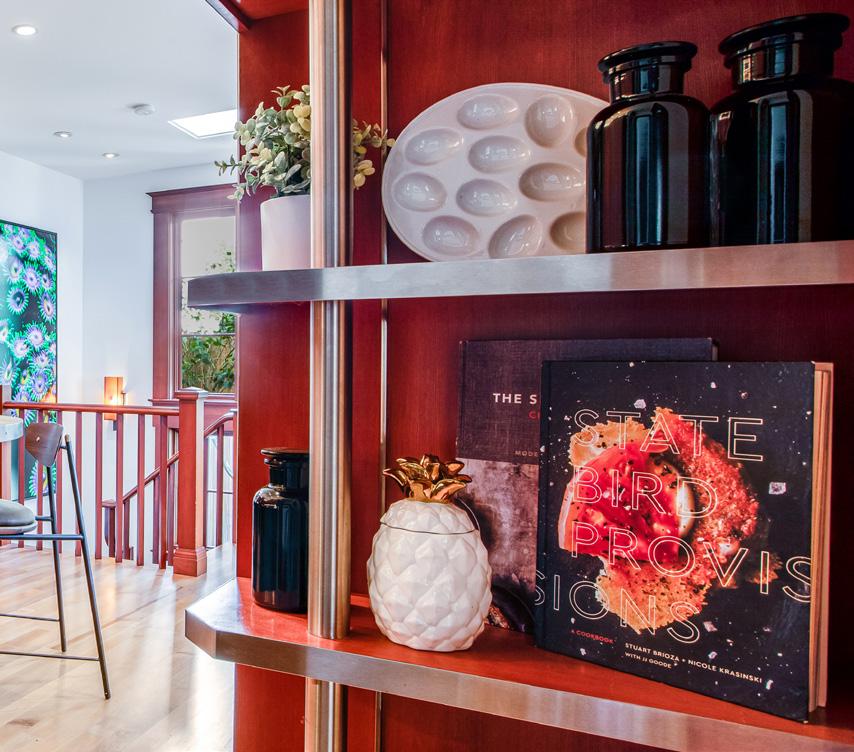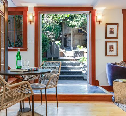 Garden rooms are a masterwork of space organization, creating a media room, office, clever galley kitchen, bath, laundry, and wine storage closet framed by an antique sliding Japanese tansu door. This welcoming and hardworking space can be optimized for guest or AirBnB. A tradesmen’s entry accesses the street and small-space parking for two cars (or storage) and potentially four cars including on street parking.